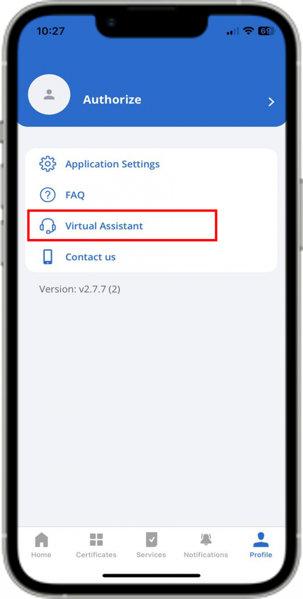 - On the homepage of the Egov Mobile application, tap the 'Profile' tab (located in the lower right corner) without completing the authorization or registration process. Then, proceed to the 'Virtual Assistant' tab. Click the 'Calls' icon at the bottom of the page, then click 'Video Call'. Grant access to the camera and microphone.