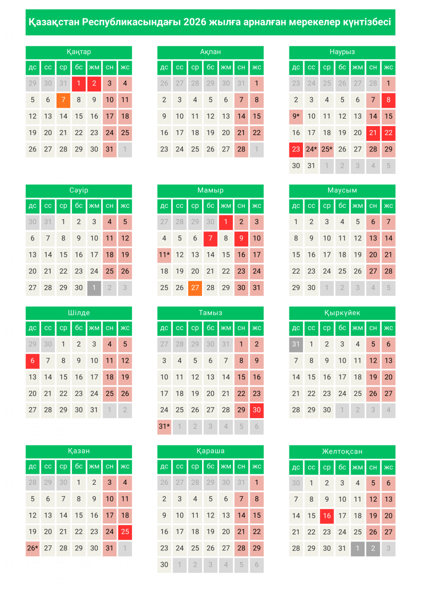 2026 жылы Қазақстан Республикасындағы мереке және демалыс күндер Баспаға шығару нұсқасы