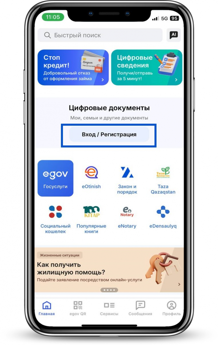 - На главной странице приложения eGov Mobile нажмите «Вход/Регистрация»