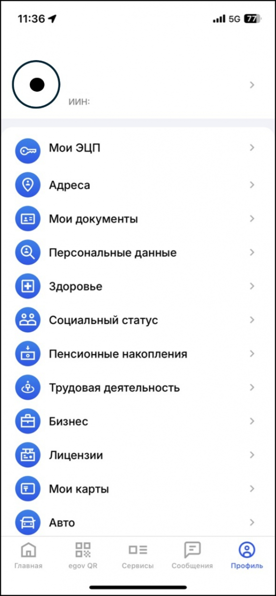 - Перейдите в «Профиль», далее в раздел «Контактные данные» (в шапке приложения, где указаны ФИО пользователя и ИИН).