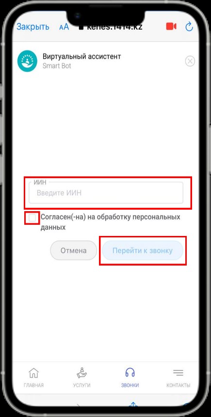 - В появившемся окне необходимо указать ИИН пользователя, дать согласие на обработку персональных данных, перейти к звонку.
