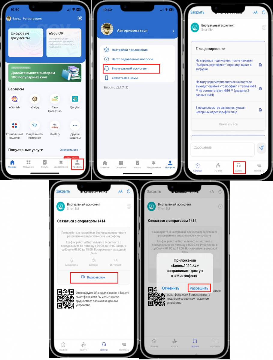 - На главной странице в мобильном приложении Egov Mobile пройдите во вкладку «Профиль» (в нижнем правом углу), без прохождения процедуры авторизации/регистрации, далее необходимо пройти по вкладке «Виртуальный ассистент». Нажмите на иконку «звонки», в нижней части страницы, далее «видеозвонок». Дайте разрешение на доступ к камере и микрофону.